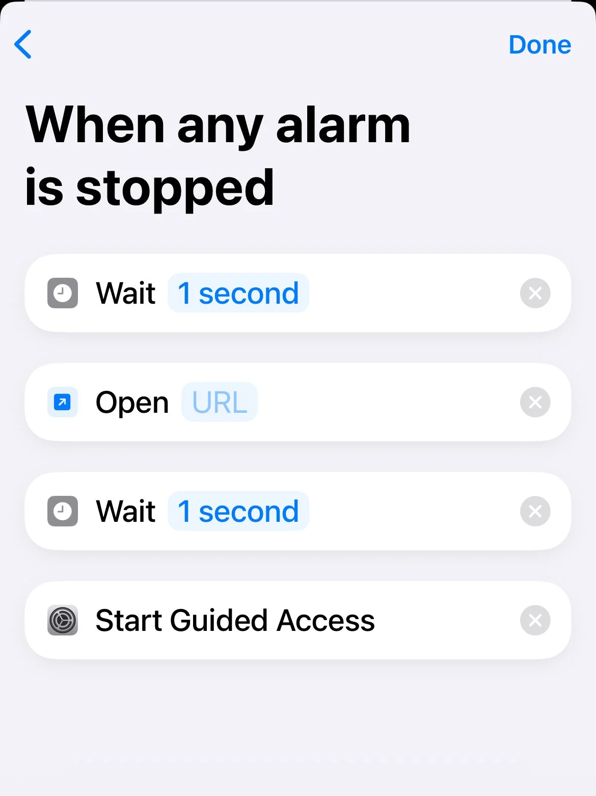 Now this isn’t completely feasible on iOS given Apple’s security features. But I was able to hack the use of Shortcuts + Custom Automations + Guided Access that automatically launches the app once your alarm is off, starts guided access (which locks your phone on the app), and you have to enter a passcode once you’ve taken your medications to access the rest of your apps.